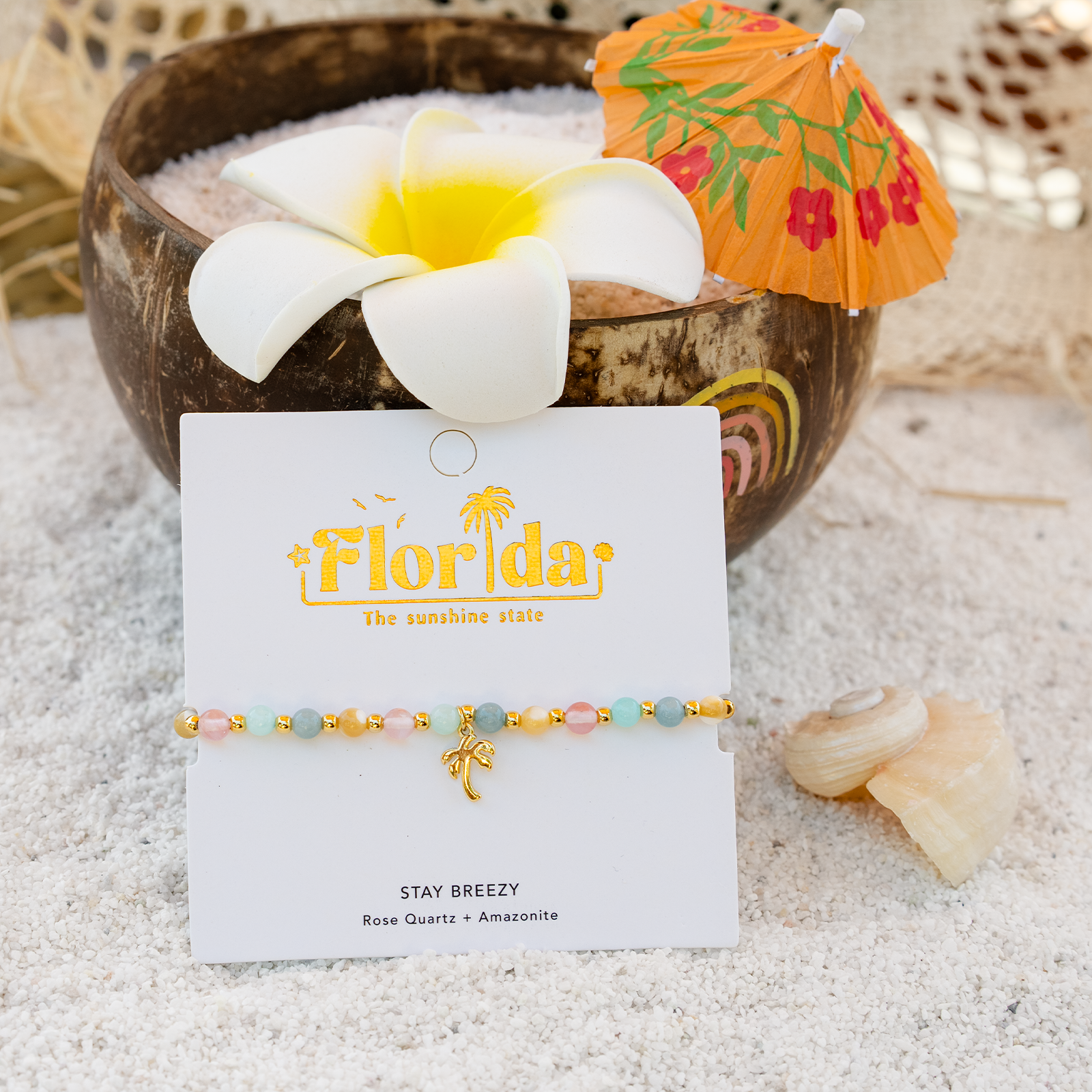 The Florida Stay Breezy Bracelet captures the carefree spirit of the Sunshine State in a wrist-friendly design. Inspired by dazzling white sand beaches, vibrant tropical colors, and iconic Florida symbols, this bracelet brings a slice of Florida sunshine to everyday style. It features genuine rose quartz to open the heart and amazonite to invite inner peace, pairing comforting energy with a sun-kissed aesthetic.