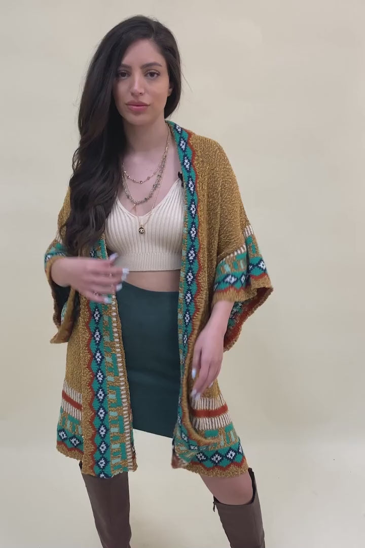Discover our "Kachina Tapestry Knit Cardigan Ruana" – a cozy blend of vibrant Kachina-inspired patterns and ultimate comfort. Wrap yourself in style with its relaxed fit and playful design, perfect for any occasion. Elevate your look and embrace the joy of artistry fused with fashion.