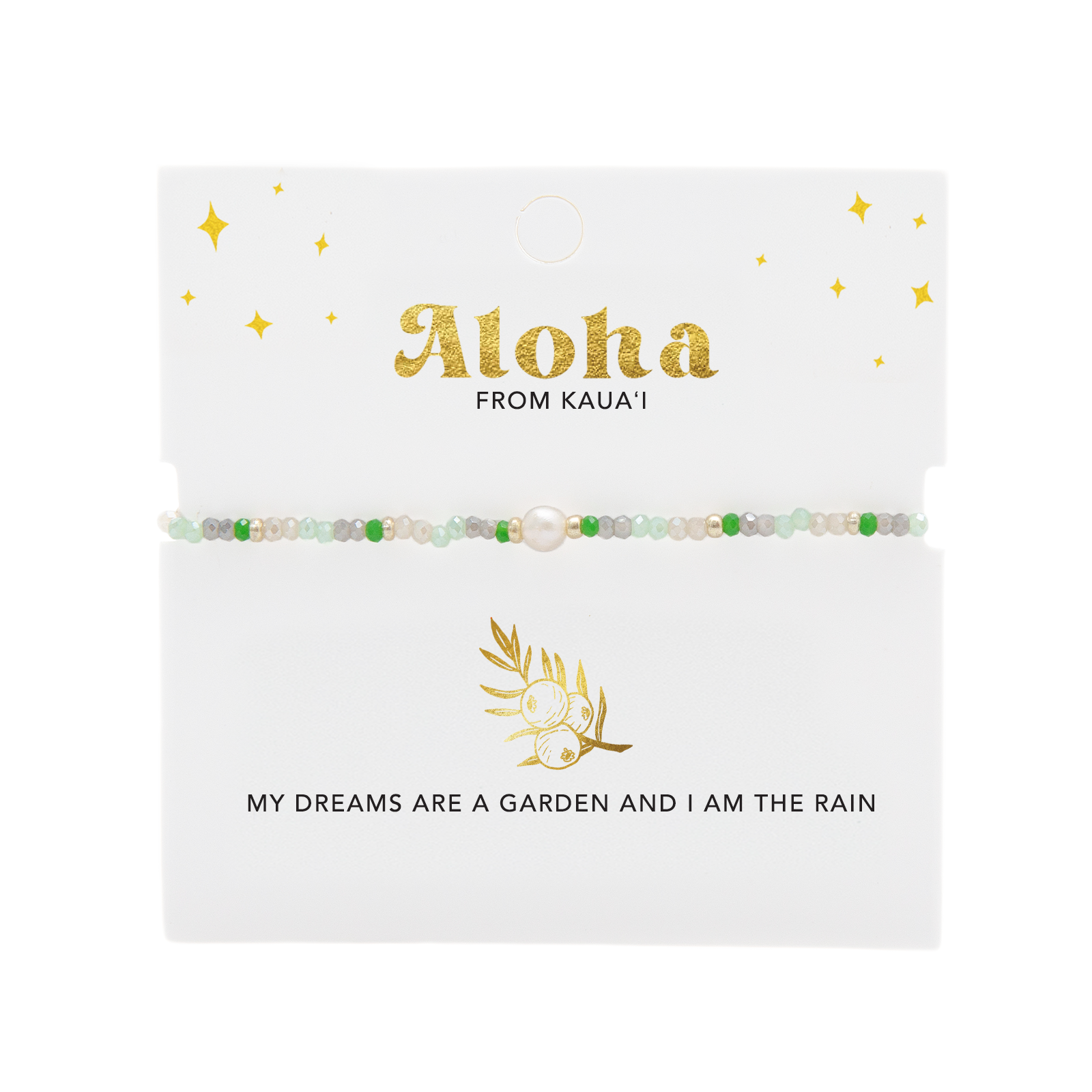 Carry the spirit of the Mokihana Berry as a talisman and memento of Kaua‘i. Repeat this mantra as needed: “My Dreams are a Garden, and I am the Rain.”
