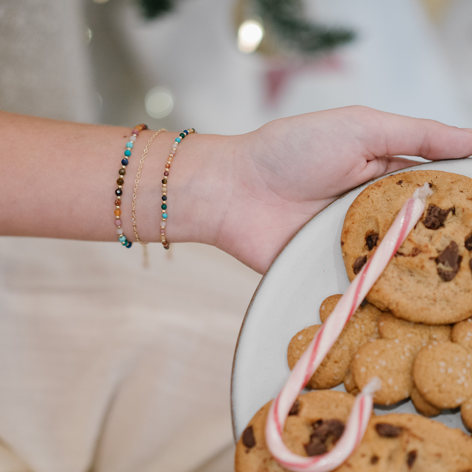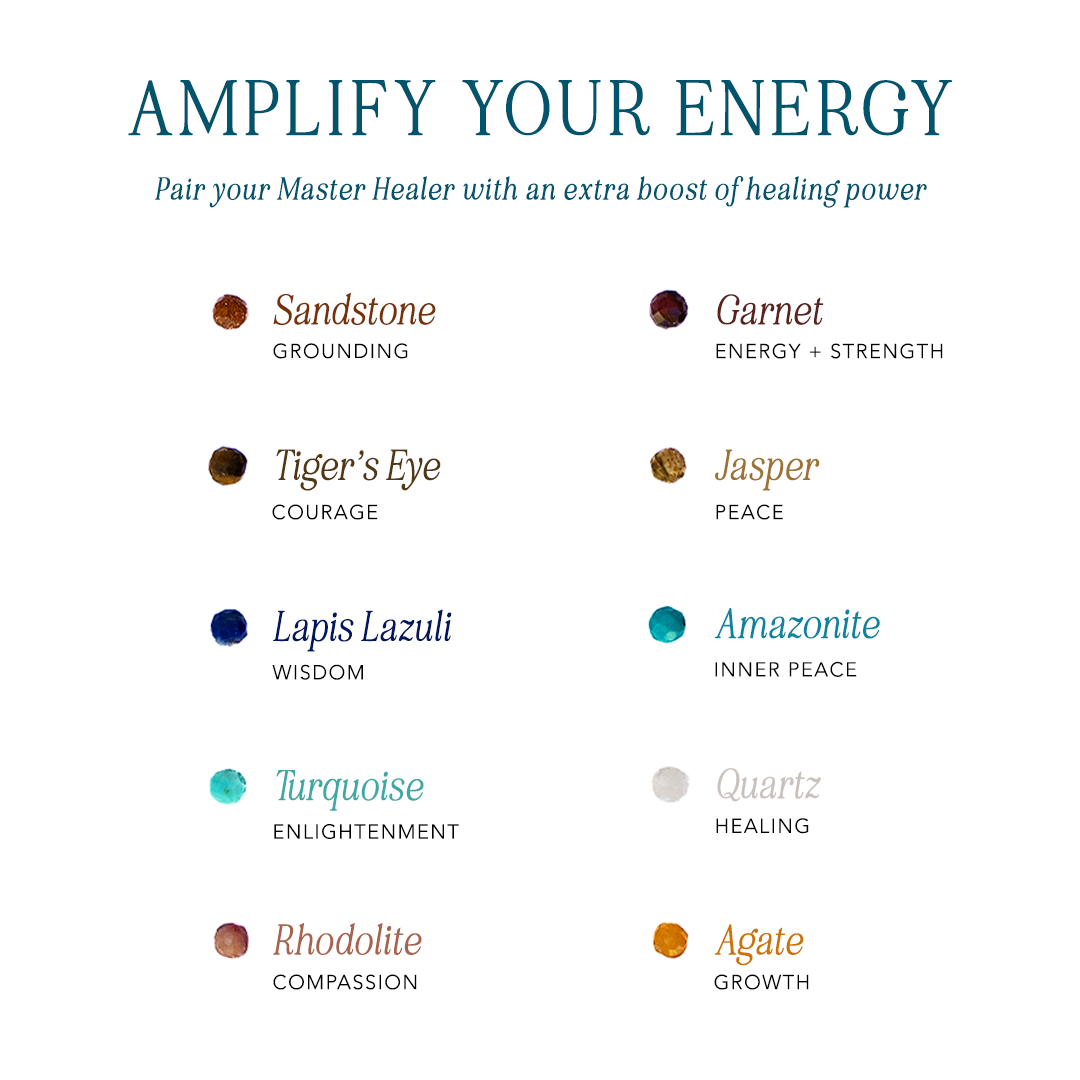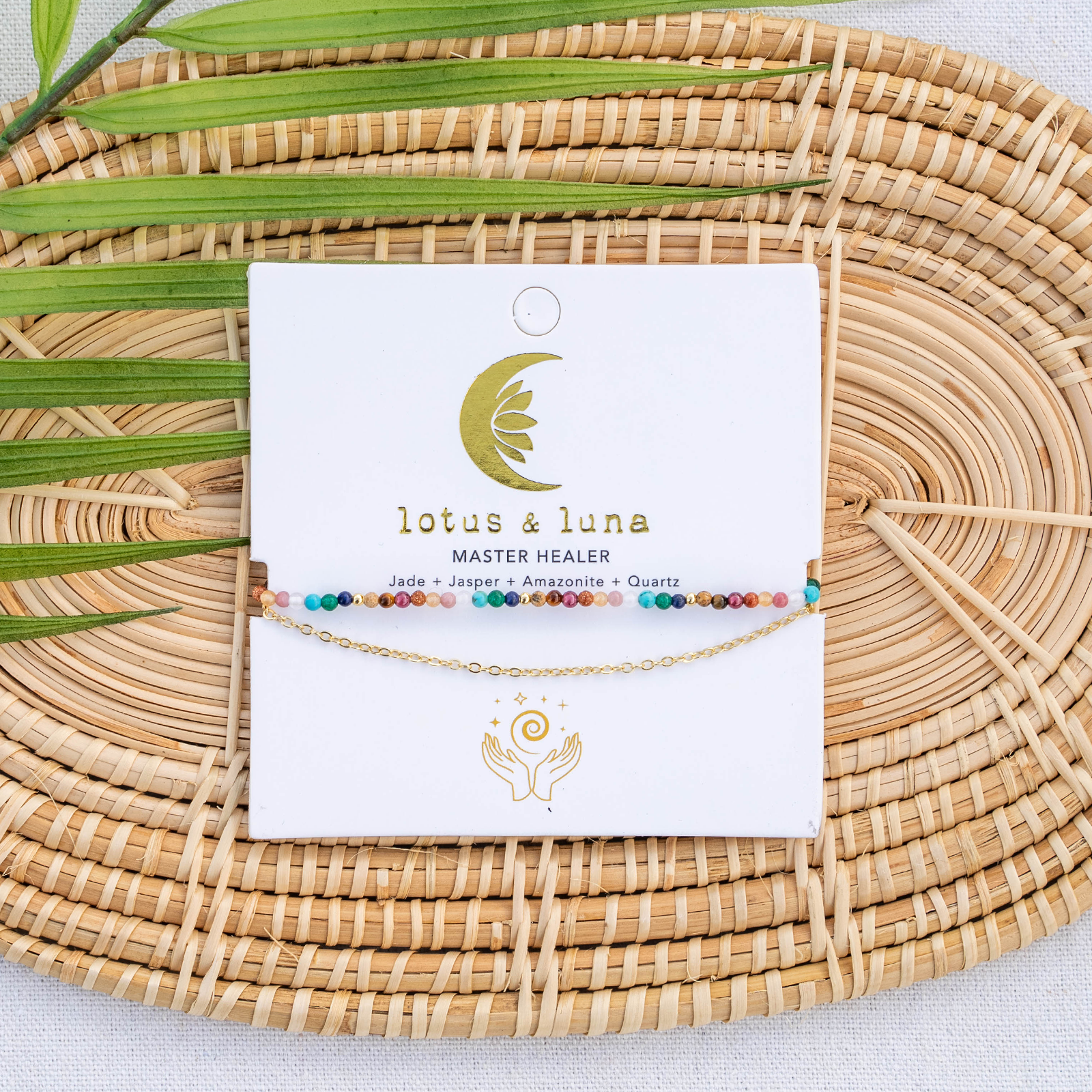 Master Healer 2mm Layered Healing Bracelet, a chakra bracelet, harmonizes mind, body, and spirit with seven chakra-stimulating stones. This delicate 2mm bracelet features shimmering metal accents, natural healing stones, and a built-in stack designed to layer with other pieces. Choose between silver or gold and pair with the Master Healer Necklace for a coordinated, elegant set you’ll wear daily. Each stone is positioned to balance energy across the chakras, magnified by their close proximity. The collection includes Lapis Lazuli, Quartz, Turquoise, Rose Quartz, Rhodolite, Agate, Sandstone, Garnet, Tiger's Eye, and Jasper, delivering clarity, calm, and resilience in everyday moments. Wear with intention to invite earth-born powers—peace, prosperity, strength, courage, love, and compassion—whether you’re meditating, working, or navigating a busy day.