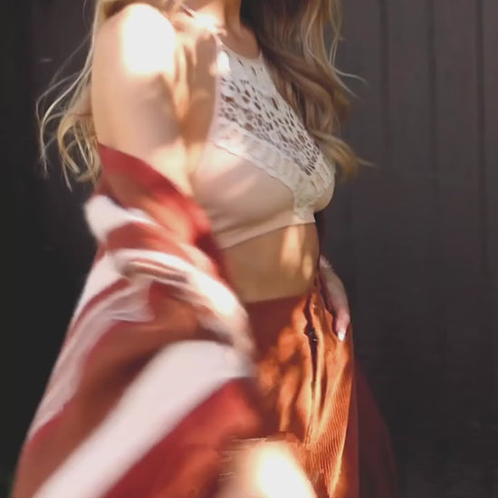 We're not sure what's more fascinating about this Striped Frayed Edge Ruana - the rust color, or the frayed edges! You'll be too warm and toasty to go anywhere without it.