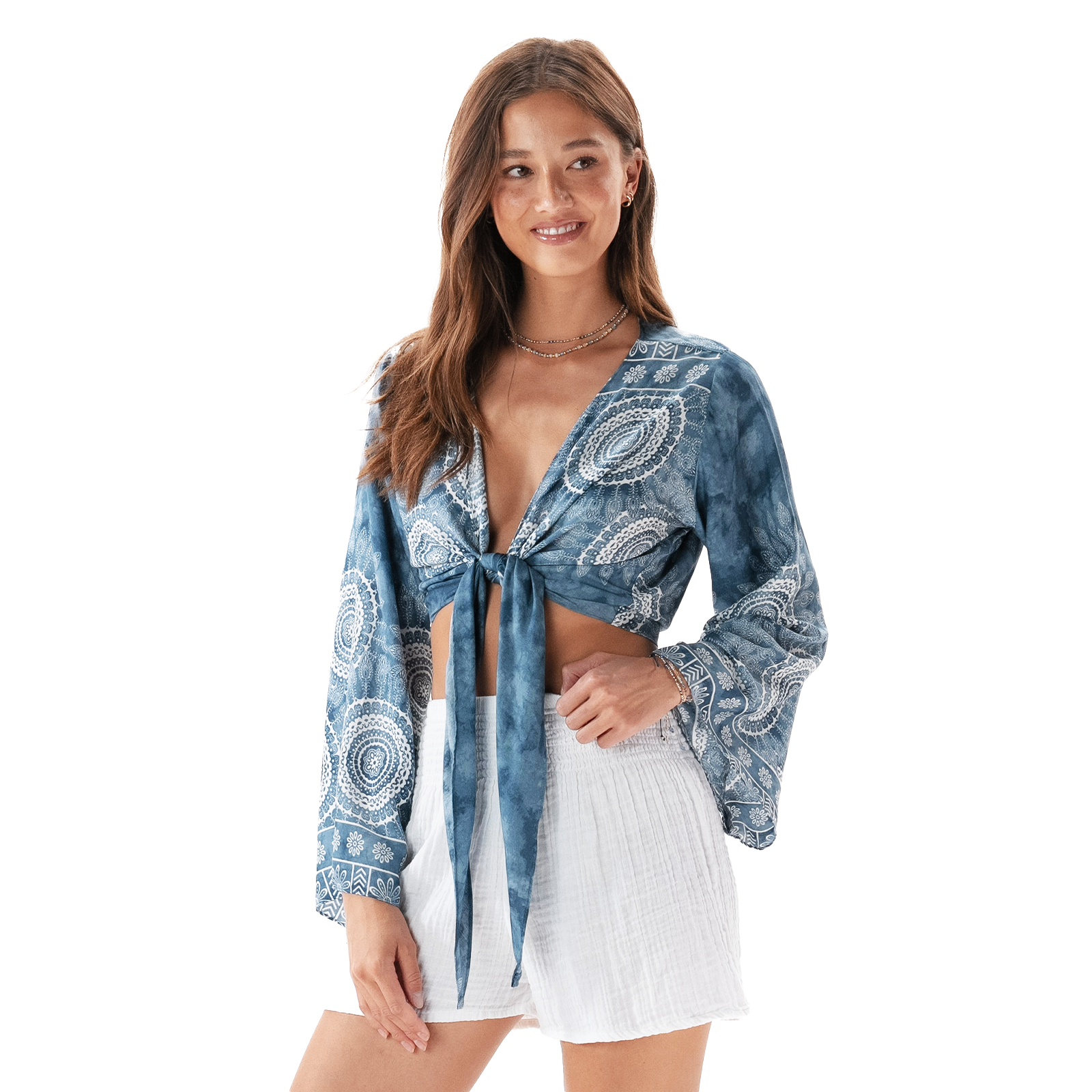 Drape yourself in whimsical worldly girl vibes in this beautiful tie front Daydreamer Top! This easy-to-style, adjustable layering piece has a flowy bell sleeve that complements any look.